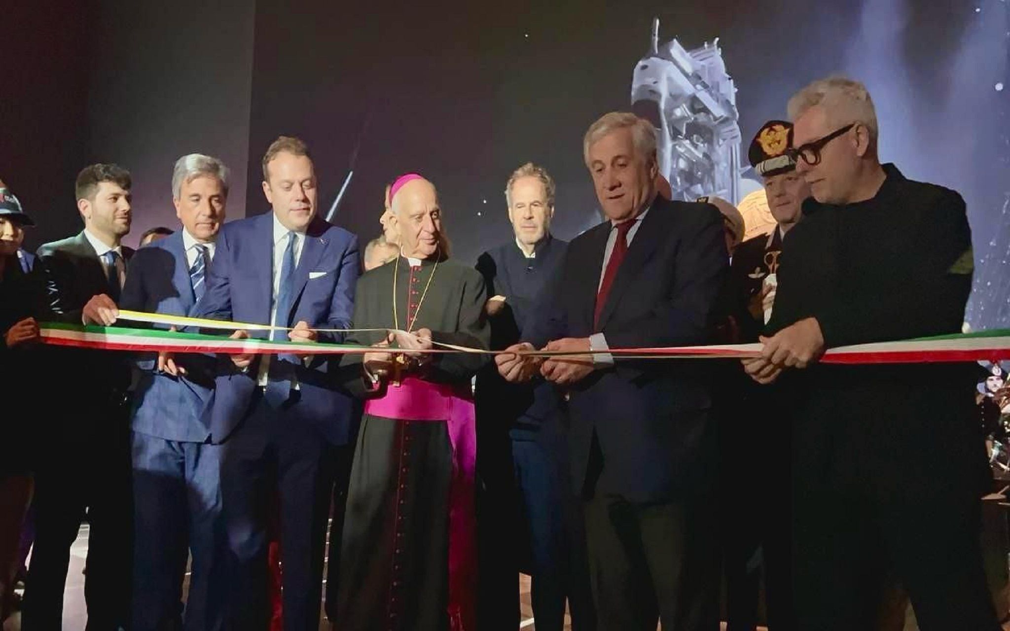 Ribbon cutting with the Vice President of the Council and Minister of Foreign Affairs and International Cooperation, Antonio Tajani, the Commissioner General for Italy at Expo 2025 Osaka, Ambassador Mario Vattani, and the Commissioner General of the Pavilion of the Holy See, Pro-Prefect of the Dicastery for Evangelization, Monsignor Rino Fisichella. Present for the Municipality of Venice, Mayor Luigi Brugnaro.